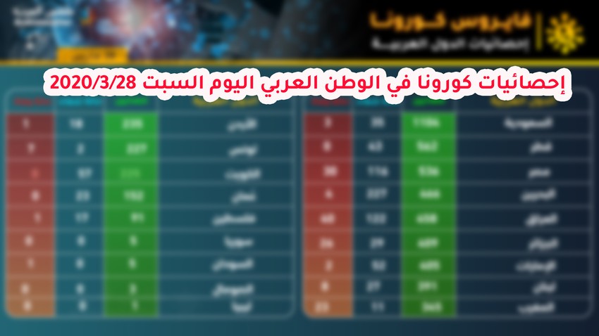وأما أحدث إحصائيات الدول العربية حول الفايروس كورونا حتى صباح اليوم السبت | 2020/3/28:
